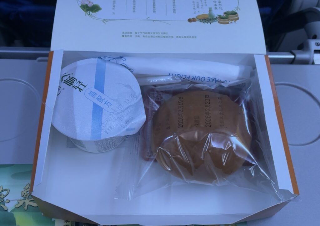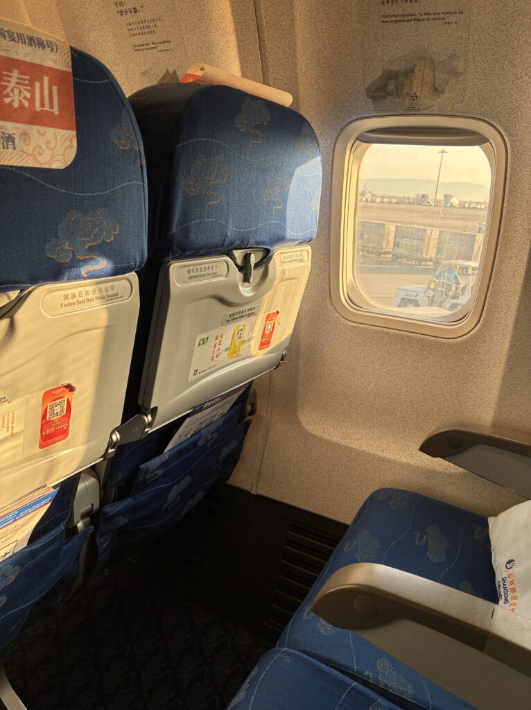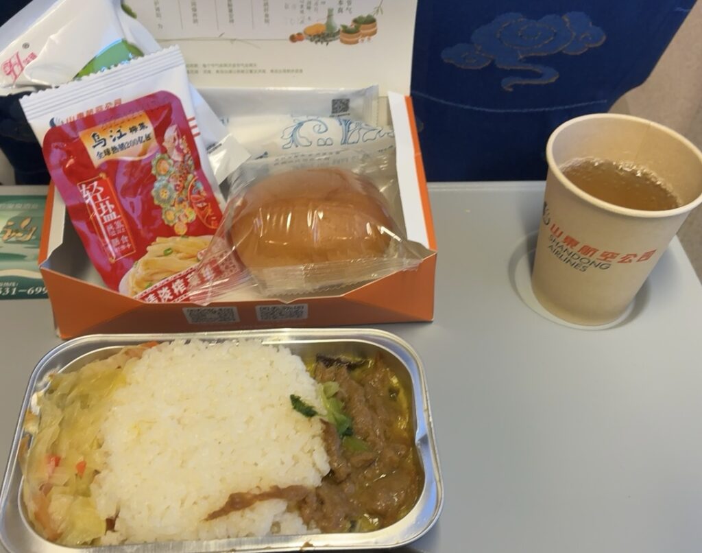 青島までのフライトは満席らしくプレミアムエコノミーにアップグレードしていただきました。
