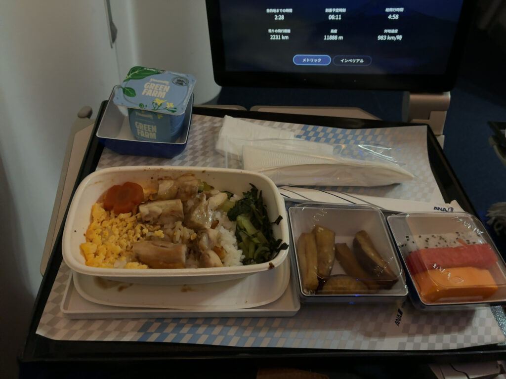 眠たくはなかったですが、気づけば寝てて電気が明るくなっていました。沖縄県上空で機内食の時間でした。