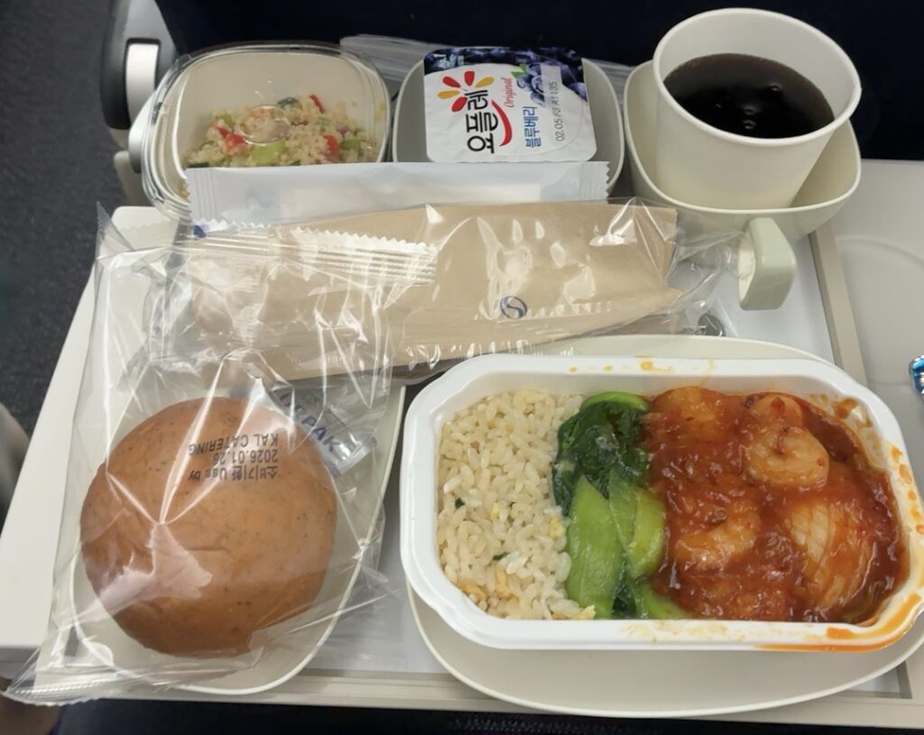 機内食はビビンバか魚って言われたので魚の方にしました。エビチリみたいな感じですごく辛かったですが、美味しかったです。